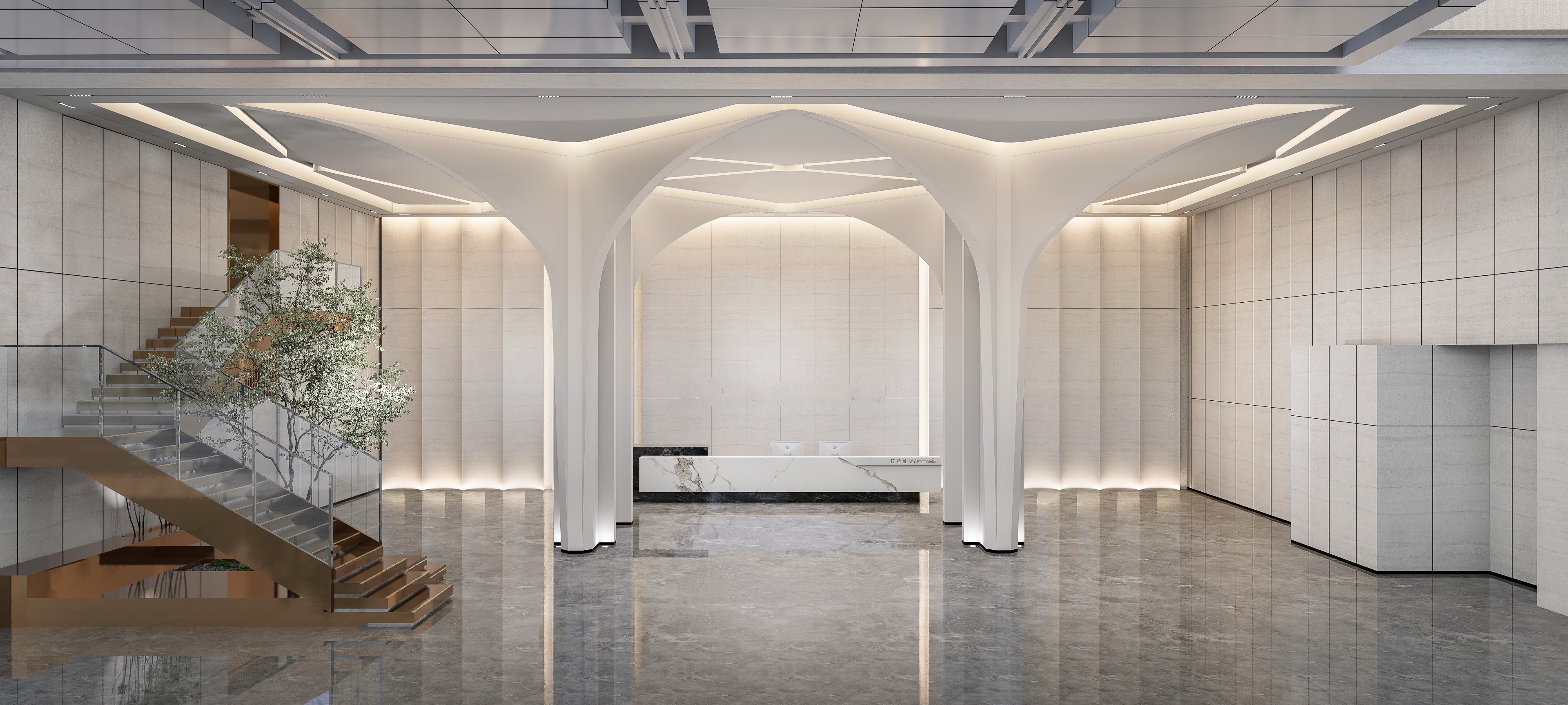 This project showcases a sleek and contemporary office environment designed around light, openness, and connection. The central atrium integrates greenery and natural light to create a calm and inviting atmosphere, while the main lobby features refined materials and transparent elements that emphasize sophistication and clarity. Together, these spaces alance modern aesthetics with functionality, promoting a sense of harmony and productivity.